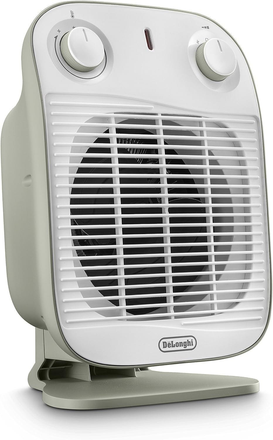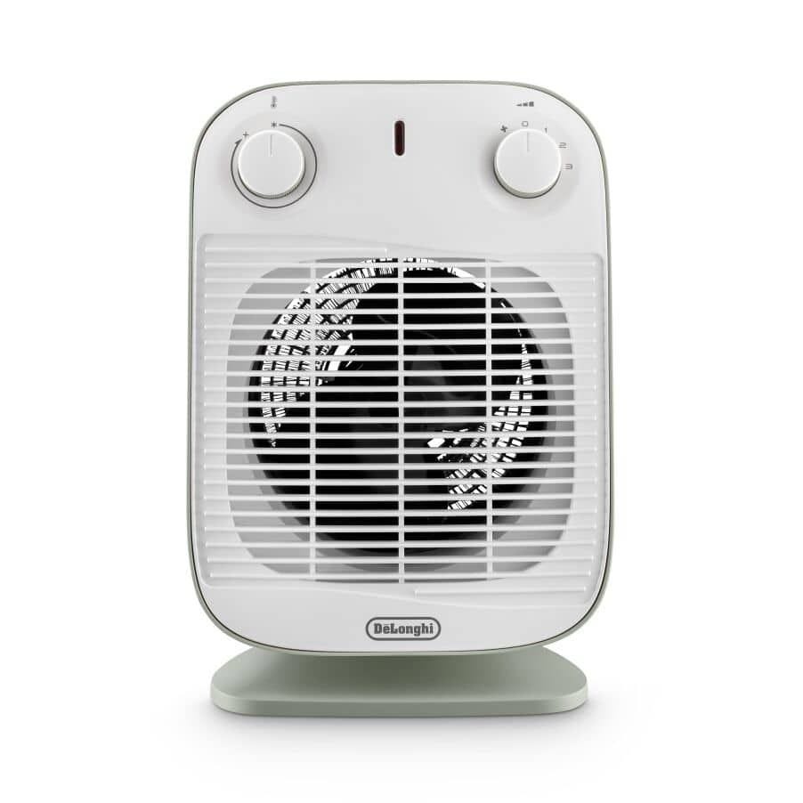 Powerful 2000W DeLonghi fan heater in green. Fast, efficient heating with modern design and safety features.
