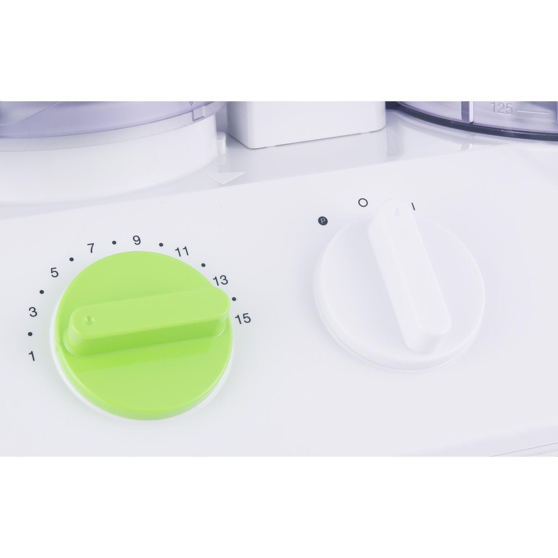 Food processor – White color. Includes a 2L plastic main bowl (1.5kg dough capacity) and a 750ml plastic chopping bowl. All removable parts are dishwasher safe. Features a dual safety system, pulse function for whipping, and a dedicated cord storage compartment.