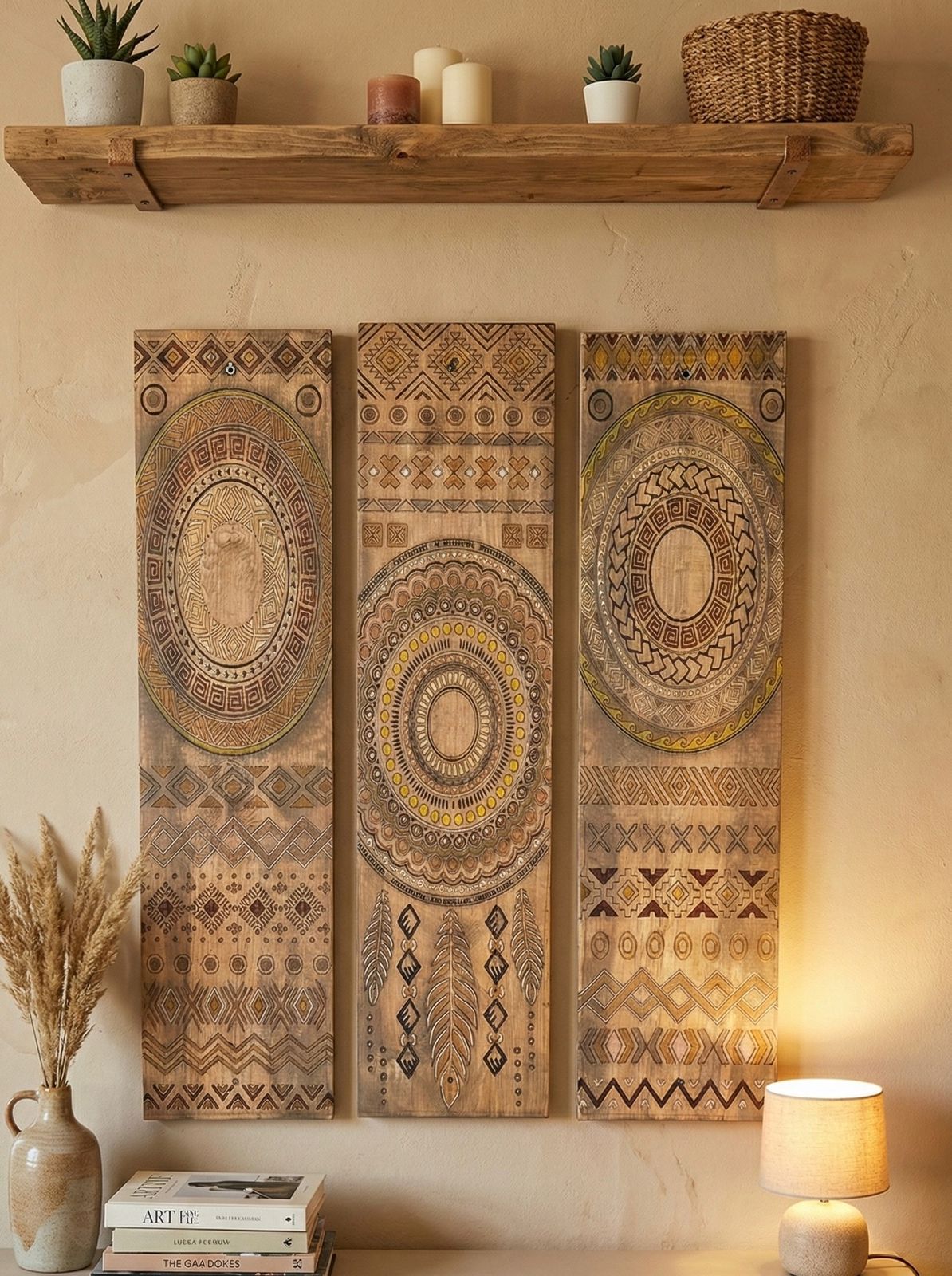 Bring warmth, culture, and craftsmanship into your home with this Hand-Carved Boho Wooden Wall Art Set. Each of the three panels is individually engraved and hand-painted by skilled artisans, using traditional techniques that require hours of precise work.