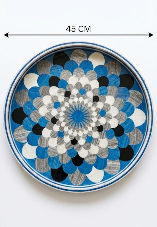 Bring a bold artistic touch to your home with this handcrafted round wooden serving tray, featuring a stunning blue mandala design. Carefully inlaid with genuine mother of pearl, the intricate geometric pattern blends shades of blue, white, and grey to create a captivating focal point.