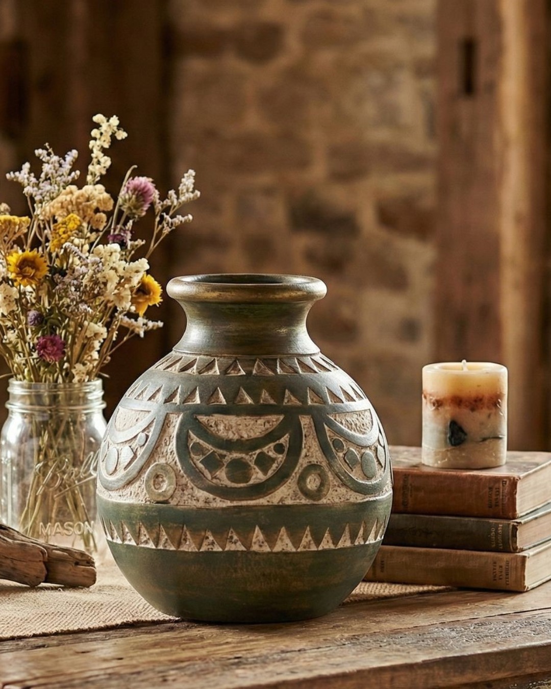 Add warmth and character to your space with this handcrafted pottery vase, beautifully finished in rich earthy Green tones with subtle rustic accents. Each vase is individually hand-painted, giving it a unique depth of color and an authentic artisanal feel.