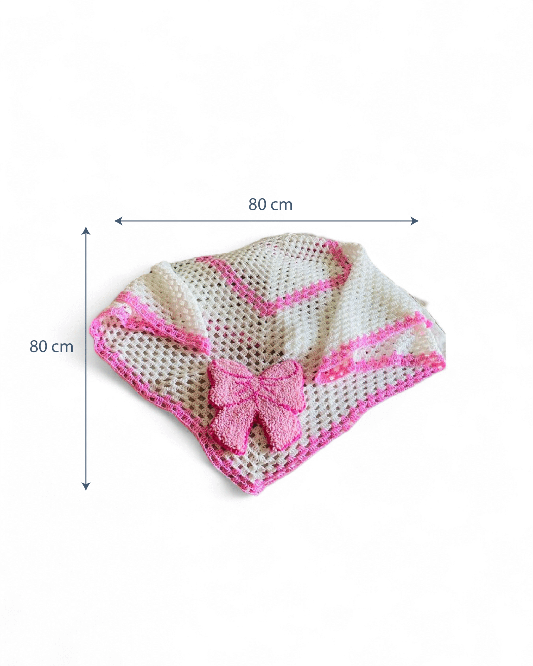 The blanket features a charming white crochet base with delicate pink accents, finished with a lovely 3D bow detail that adds a playful and elegant touch. Its breathable crochet design keeps your baby cozy without overheating, making it suitable for year-round use.