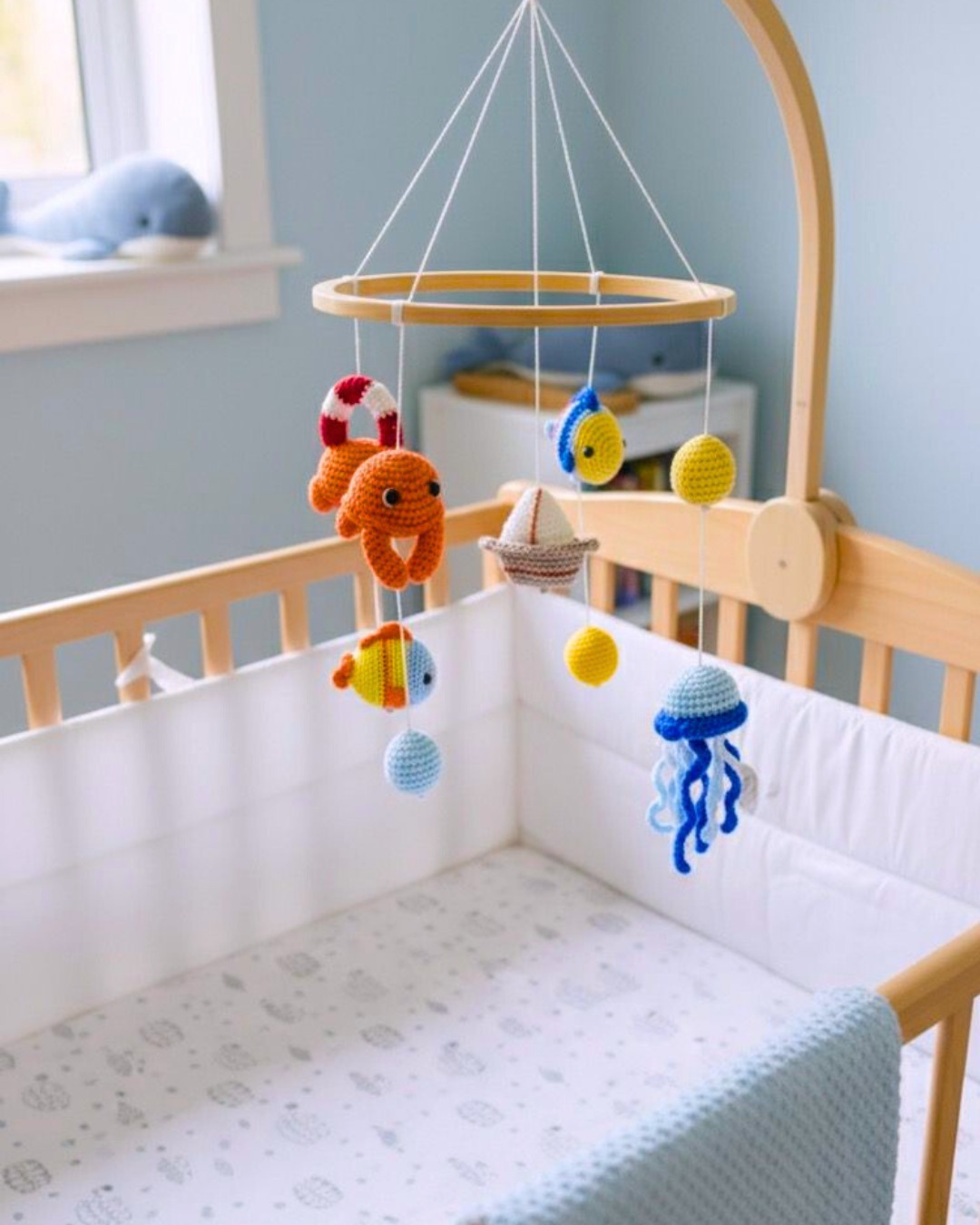 Bring the calming beauty of the ocean to your baby’s nursery with this adorable handmade crochet baby mobile. Featuring charming sea creatures — including a jellyfish, fish, octopus, and a little sailboat — this mobile is crafted with soft, baby-safe cotton yarn. It gently sways above the crib, capturing your baby’s attention and encouraging visual development and relaxation. Perfect as a thoughtful baby shower gift or a sweet addition to any nursery décor.