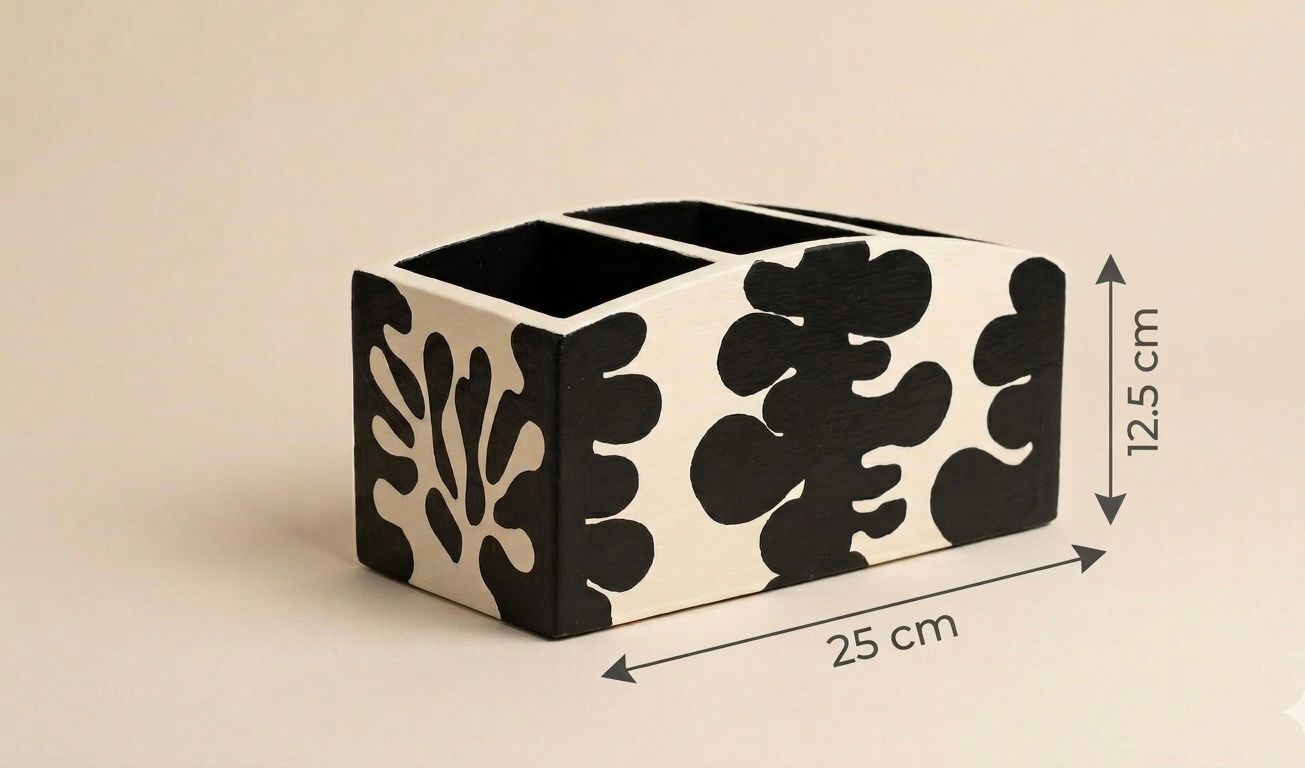 Elevate your workspace with this beautifully crafted handmade wooden desk organizer. Designed with a modern artistic touch, this storage box features unique hand-painted black abstract patterns on a natural wood finish, making each piece truly one of a kind.