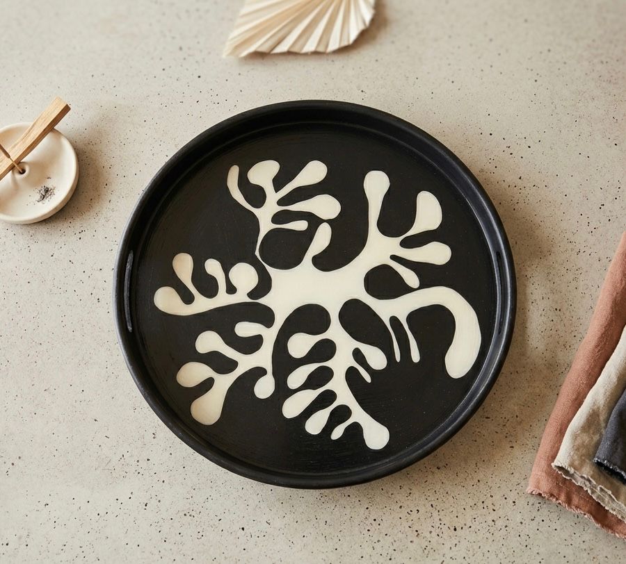 Add a touch of artistic elegance to your home with this handmade wooden serving tray. Featuring a striking hand-painted abstract design in a modern black and natural wood contrast, this round tray is both functional and decorative, making it a standout piece for any space.