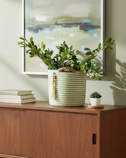 A lovely blend of jute and macramé that adds a boho touch to my home. It’s more decorative than functional, but it looks great on shelves. bassmla