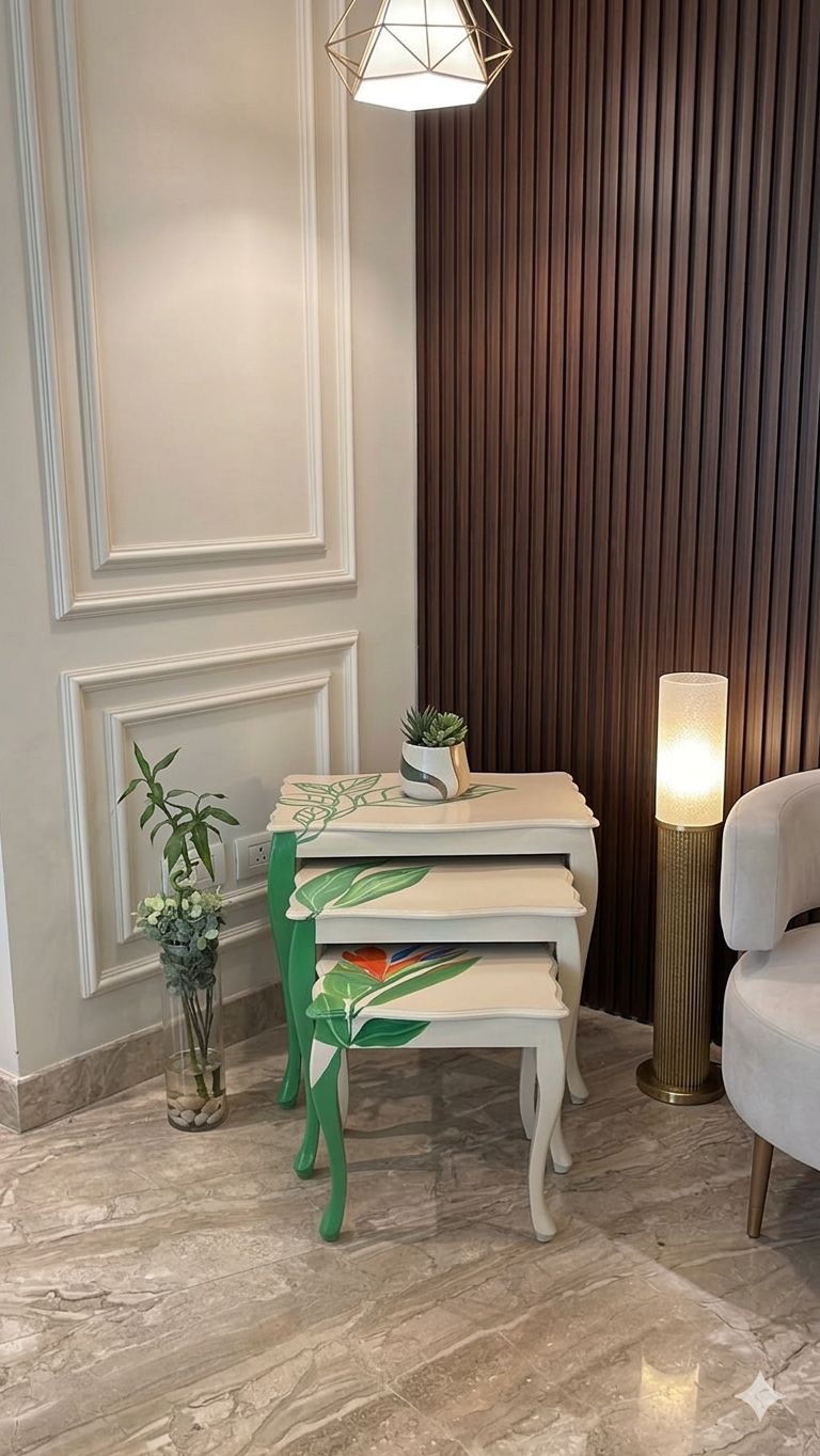 Add an artistic tropical touch to your space with this beautifully handcrafted set of wooden nesting tables. Each table features a unique hand-painted botanical design, inspired by lush tropical leaves and vibrant nature tones. The elegant curved legs and soft neutral base color highlight the detailed artwork, making every piece feel like a small statement of art.